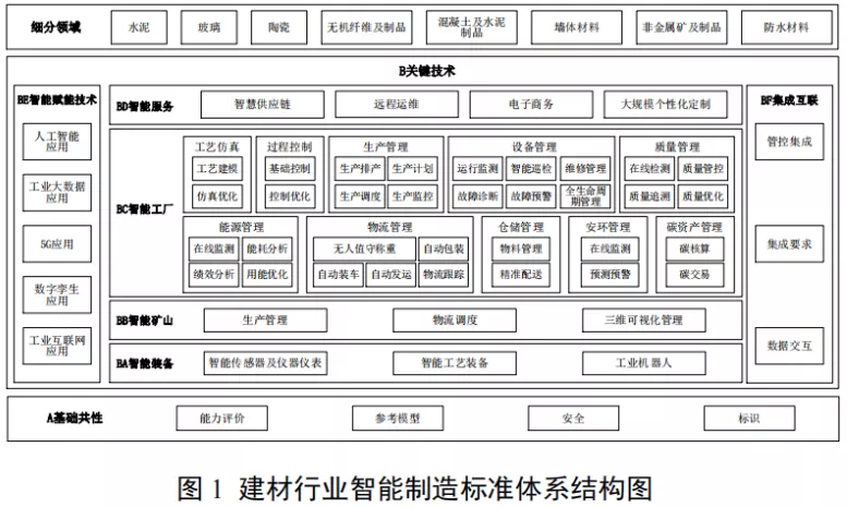 建材行業(yè)智能制造標(biāo)準(zhǔn)體系結(jié)構(gòu)包括基礎(chǔ)共性、關(guān)鍵技術(shù)兩部分,如圖1所示。其中關(guān)鍵技術(shù)標(biāo)準(zhǔn)涵蓋了建材行業(yè)智能制造核心標(biāo)準(zhǔn),適用于指導(dǎo)水泥、玻璃、陶瓷、無機(jī)纖維及制品、混凝土及水泥制品、墻體材料、非金屬礦及制品、防水材料等細(xì)分領(lǐng)域開展智能制造標(biāo)準(zhǔn)研制工作。具體內(nèi)容如下: