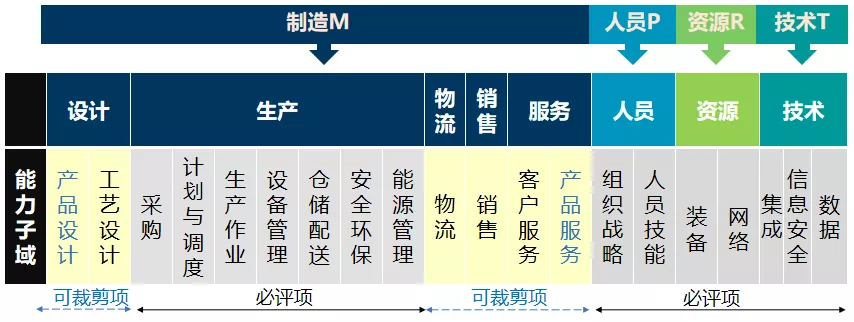 根據(jù)《GB/T 39117-2020智能制造能力成熟度評(píng)估方法》(后簡(jiǎn)稱《評(píng)估方法》),所有企業(yè)都會(huì)評(píng)估的14個(gè)能力子域,包括生產(chǎn)涵蓋的7個(gè)能力子域:采購(gòu)、計(jì)劃調(diào)度、生產(chǎn)作業(yè)、設(shè)備管理、倉(cāng)儲(chǔ)配送、安全環(huán)保、能源管理,以及人員、資源、技術(shù)要素下的7個(gè)能力子域:組織戰(zhàn)略、人員技能、裝備、網(wǎng)絡(luò)、集成、信息安全、數(shù)據(jù)。企業(yè)根據(jù)自身涉及的業(yè)務(wù)活動(dòng),提交評(píng)估申請(qǐng)時(shí)可對(duì)6個(gè)能力子域進(jìn)行裁剪:產(chǎn)品設(shè)計(jì)、工藝設(shè)計(jì)、物流、銷售、客戶服務(wù)、產(chǎn)品服務(wù)。