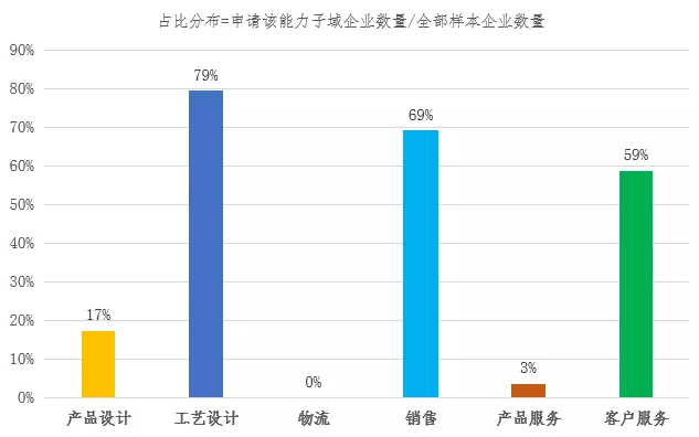 從上述占比可見,申請(qǐng)?jiān)u估的二級(jí)制造企業(yè)通常具備【工藝設(shè)計(jì)】職能,這也是由于工藝設(shè)計(jì)與產(chǎn)品生產(chǎn)活動(dòng)非常密切,且從事生產(chǎn)工藝設(shè)計(jì)時(shí)還需考慮工廠、車間具備的實(shí)際設(shè)備資源加工能力。同樣,【銷售】與【客戶服務(wù)】職能也是大部分二級(jí)企業(yè)具備的業(yè)務(wù),這些企業(yè)多處于單一主體、本地化建設(shè)模式。當(dāng)然也有小部分企業(yè)已經(jīng)是多生產(chǎn)基地、集團(tuán)制管理模式,其工藝設(shè)計(jì)、銷售或客戶服務(wù)職能歸屬上級(jí)集團(tuán)或集團(tuán)子公司負(fù)責(zé),因此相應(yīng)能力域不參與評(píng)估。
