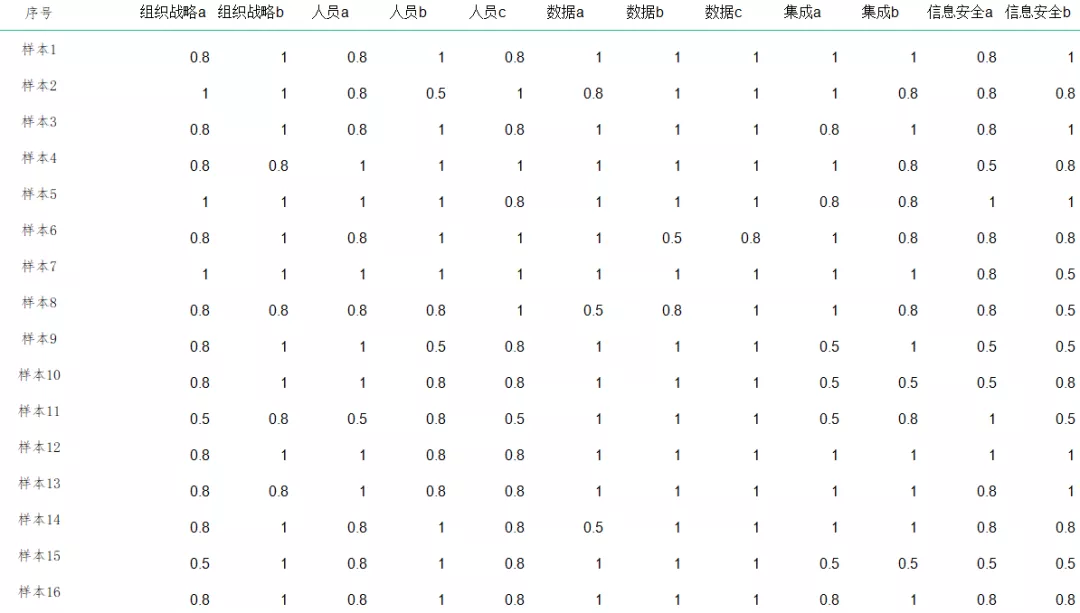 能力分析的樣本數(shù)據(jù)主要來(lái)自被評(píng)估企業(yè)二級(jí)條款的打分結(jié)果,分析過(guò)程無(wú)企業(yè)名稱,僅以樣本形式表現(xiàn)。例如,在“樣本11”中,該企業(yè)的組織戰(zhàn)略二級(jí)a條款打分0.5分,b條款打分0.8分。