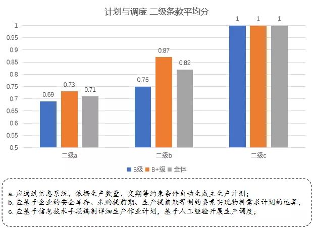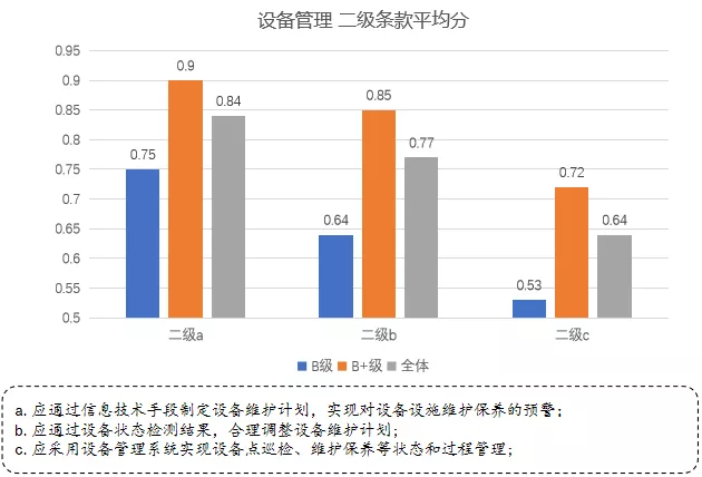 如前所述,“設(shè)備管理”在所有能力子域中得分最低,特別是二級(jí)b條款、c條款分?jǐn)?shù)較低,同時(shí)各條款在B級(jí)和B+級(jí)企業(yè)間表現(xiàn)也有明顯差距。