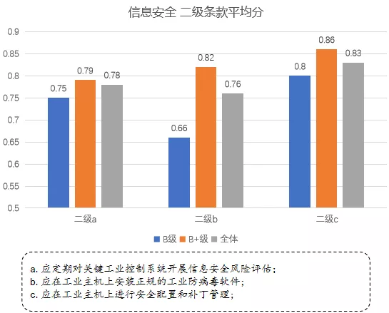 二級(jí)b條款關(guān)于工業(yè)防病毒軟件的安裝部署。從B級(jí)與B+級(jí)企業(yè)的得分差異可看出:企業(yè)隨著智能化建設(shè)的不斷深入,已逐漸意識(shí)到工業(yè)防病毒軟件的重要作用,對(duì)工業(yè)信息安全的重視程度也在不斷增強(qiáng)。