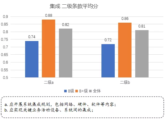 信息安全二級(jí)a條款、b條款整體分?jǐn)?shù)偏低,特別是b條款在B級(jí)企業(yè)與B+級(jí)企業(yè)能力表現(xiàn)差距較大。