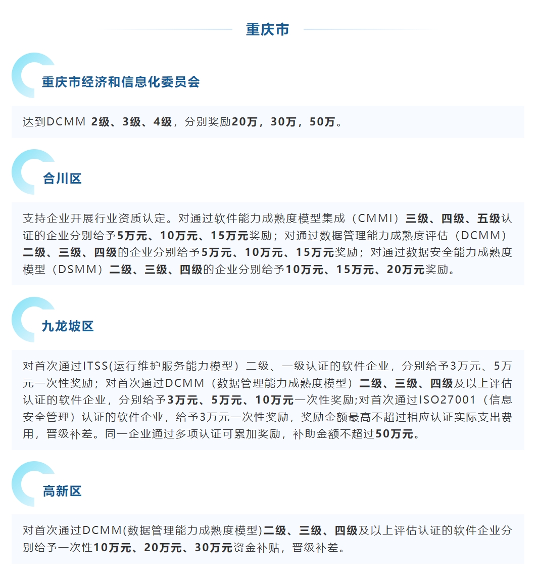 支持CMMI及DCMM認(rèn)證。對首次獲得CMMI三級、四級、五級認(rèn)證證書的企業(yè),分別獎勵10萬元、20萬元、30萬元;對首次獲得DCMM初始級、受管理級、穩(wěn)健級、量化管理級和優(yōu)化級認(rèn)證證書的企業(yè),分別獎勵10萬元、20萬元、30萬元、40萬元、50萬元。