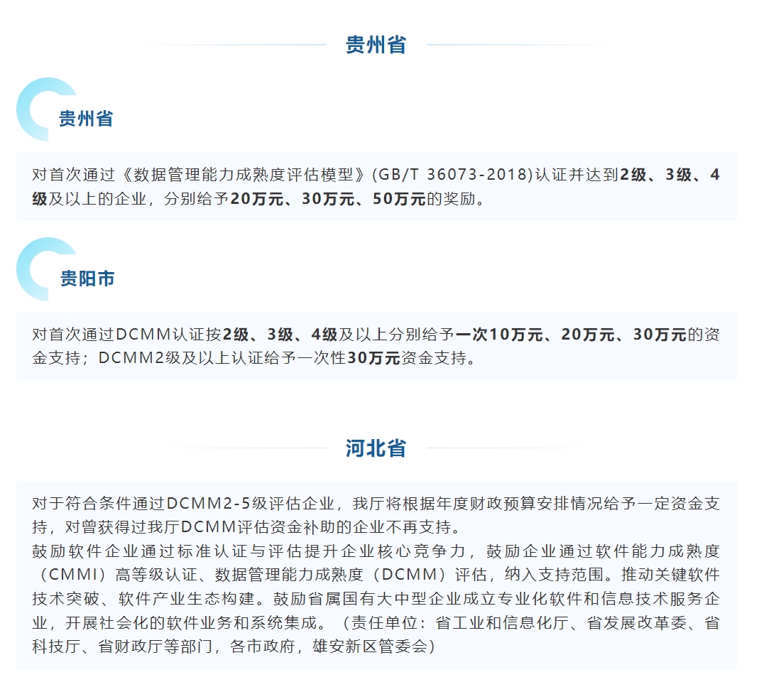 對首次通過DCMM(數(shù)據(jù)管理能力成熟度評估模型)2級、3級、4級評估認(rèn)證的企業(yè),分別給予最高20萬元、30萬元、50萬元獎勵。