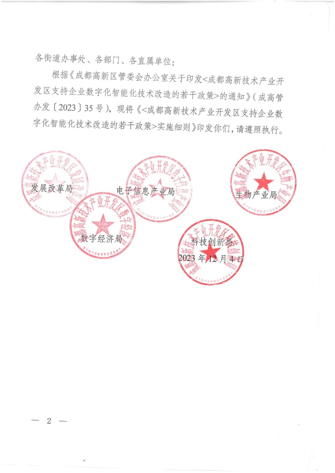 根據(jù)《成都高新區(qū)管委會(huì)辦公室關(guān)于印發(fā)<成都高新技術(shù)產(chǎn)業(yè)開發(fā)區(qū)支持企業(yè)數(shù)字化智能化技術(shù)改造的若干政策>的通知》( 成高管辦發(fā)[2023 ]35 號(hào) ),現(xiàn)將《<成都高新技術(shù)產(chǎn)業(yè)開發(fā)區(qū)支持企業(yè)數(shù)字化智能化技術(shù)改造的若干政策>實(shí)施細(xì)則》印發(fā)你們,請(qǐng)遵照?qǐng)?zhí)行。
