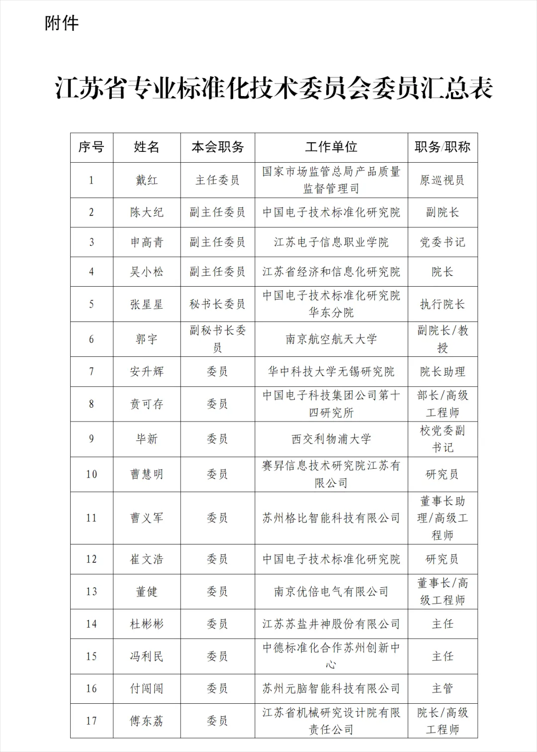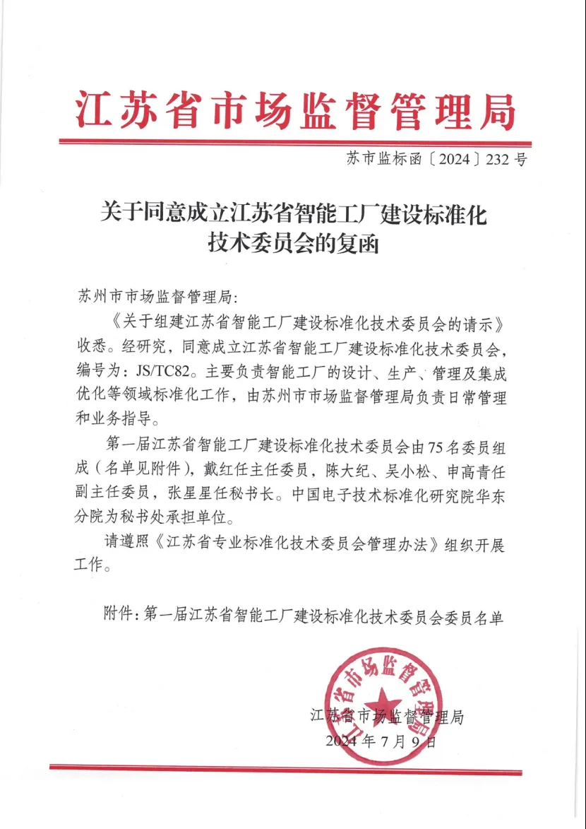 近日,江蘇省市場監(jiān)督管理局下達了同意成立江蘇省智能工廠建設(shè)標準化技術(shù)委員會的復函,編號:JS/TC82。江蘇省智能工廠建設(shè)標準化技術(shù)委員會(以下簡稱“標委會”)主要負責智能工廠的設(shè)計、生產(chǎn)、管理及集成優(yōu)化等領(lǐng)域標準化工作,由蘇州市市場監(jiān)督管理局負責日常管理和業(yè)務(wù)指導。標委會由75名委員組成(名單見附件),戴紅任主任委員,陳大紀、申高青、吳小松任副主任委員,張星星任秘書長。中國電子技術(shù)標準化研究院華東分院為秘書處承擔單位。