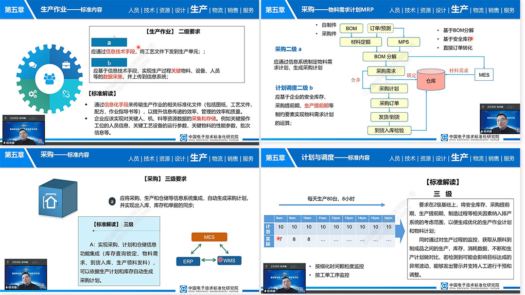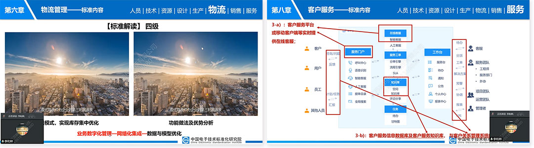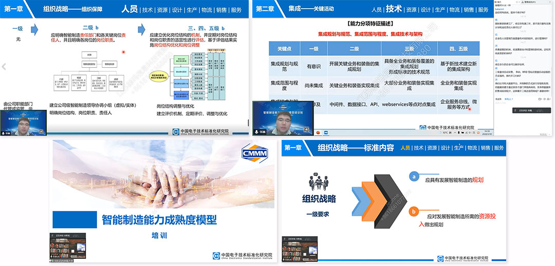 在線上培訓(xùn)一開始,中國電子技術(shù)標(biāo)準(zhǔn)化研究院華東分院副主任 葉宣辰 和 中國電子技術(shù)標(biāo)準(zhǔn)化研究院華東分院智能制造中心副主任 郎俊奇 分別對(duì)智能制造能力成熟度模型做了介紹,面向國家智能制造重大戰(zhàn)略政策及建設(shè)導(dǎo)向,對(duì)智能制造能力成熟度模型的5個(gè)等級(jí)和評(píng)估方做詳細(xì)介紹,為學(xué)員分享了標(biāo)準(zhǔn)的研制歷程、模型框架以及標(biāo)準(zhǔn)的應(yīng)用情況。同時(shí),結(jié)合企業(yè)現(xiàn)場(chǎng)實(shí)際評(píng)估案例對(duì)評(píng)估方法、評(píng)估流程等內(nèi)容進(jìn)行了分享,并介紹了智能制造評(píng)估評(píng)價(jià)公共服務(wù)平臺(tái)的應(yīng)用情況。